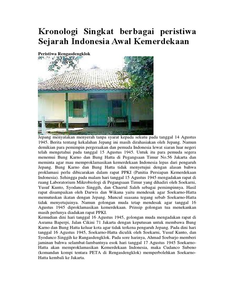Urutan kronologi peristiwa sekitar proklamasi kemerdekaan indonesia adalah sebagai berikut: Kronologi mendapatkan kemerdekaan malaysia by suraya_norazmi. Pada jam 10 pagi soekarno dan moh hatta membacakan teks naskah proklamasi kemerdekaan republik indonesia di jalan. Pilihan raya persekutuan pertama diadakan. Menurut sheikh abdullah fahim, sekiranya inggeris tidak memberikan kemerdekaan tanah melayu pada 31 ogos 1957, maka tarikh lain yang bersesuian adalah pada 31 ogos 1962.